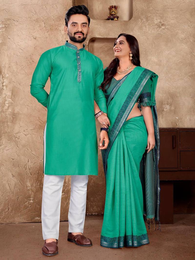 Beautiful Linen Cotton Jacquard Border Work Men's Kurta With Cotton Solid White Color Pant & Combination Color Jacquard Weaving Linen Cotton Silk Saree With Running Blouse. Kurta Size M-38,L-40,XL-42,XXL-44,3XL-46 (Pack:- 1 Saree With Un-Stitched Blouse :: 1 Kurta :: 1 Pant )