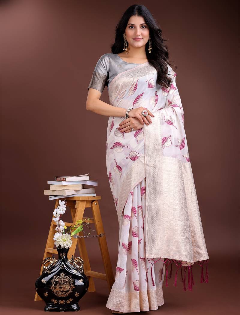 White & Purple Color Cotton Zari Woven Saree With Blouse