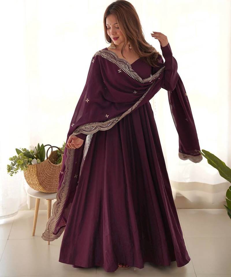 • Product Id : 4708093 • Package Details : 1 Top / 1 Pant / 1 Dupatta • Type : Anarkali Suit • Region : India • Occasion : Wedding • Type : Anarkali Suits • Look : Fashion • Sleeve : Full Sleeve • Neck Style : V Neck • Fabric : Chanderi • Color : Wine • Work : Fancy • Stitching : Stitched Payments [+]