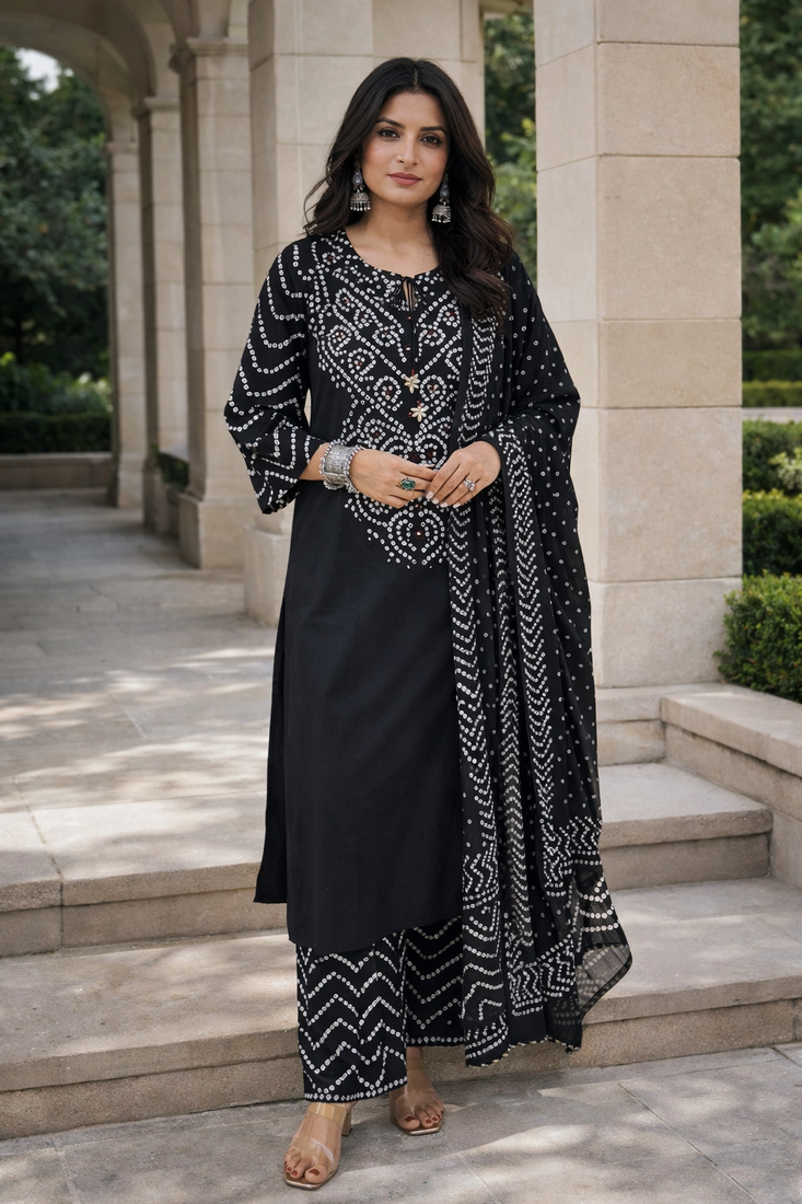 • Product Id : 4715135 • Package Details : 1 Kurta / 1 Pant / 1 Dupatta • Type : Kurta Sets • Fabric : Cotton • Work : Printed • Sleeve : Quarter Sleeve • Neck Style : V Neck • Color : Black • Stitching : Stitched • Length : 42.0 Payments [+]