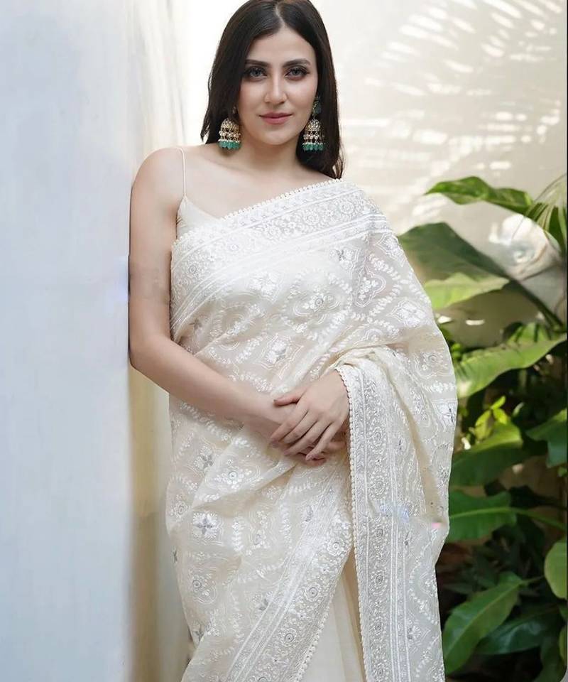 this off-white organza silk saree brings together softness, shine, and refined detailing in a graceful way. the delicate embroidered patterns across the drape add a rich touch without overpowering the subtle tone, giving it a beautifully balanced and sophisticated look.