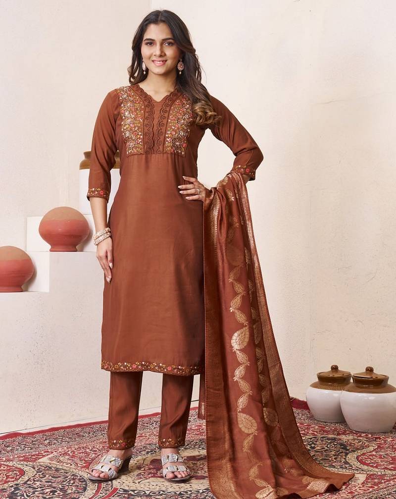 • Product Id : 4713594 • Package Details : 1 Kurti/1 Pant/1 Dupatta • Type : Kurta Sets • Occasion : Wedding • Fabric : Silk • Work : Woven • Type : Hand Embroidery • Look : Designer • Sleeve : Half Sleeve • Neck Style : V Neck • Color : Brown • Stitching : Stitched • Length : 46 Inch Payments [+]