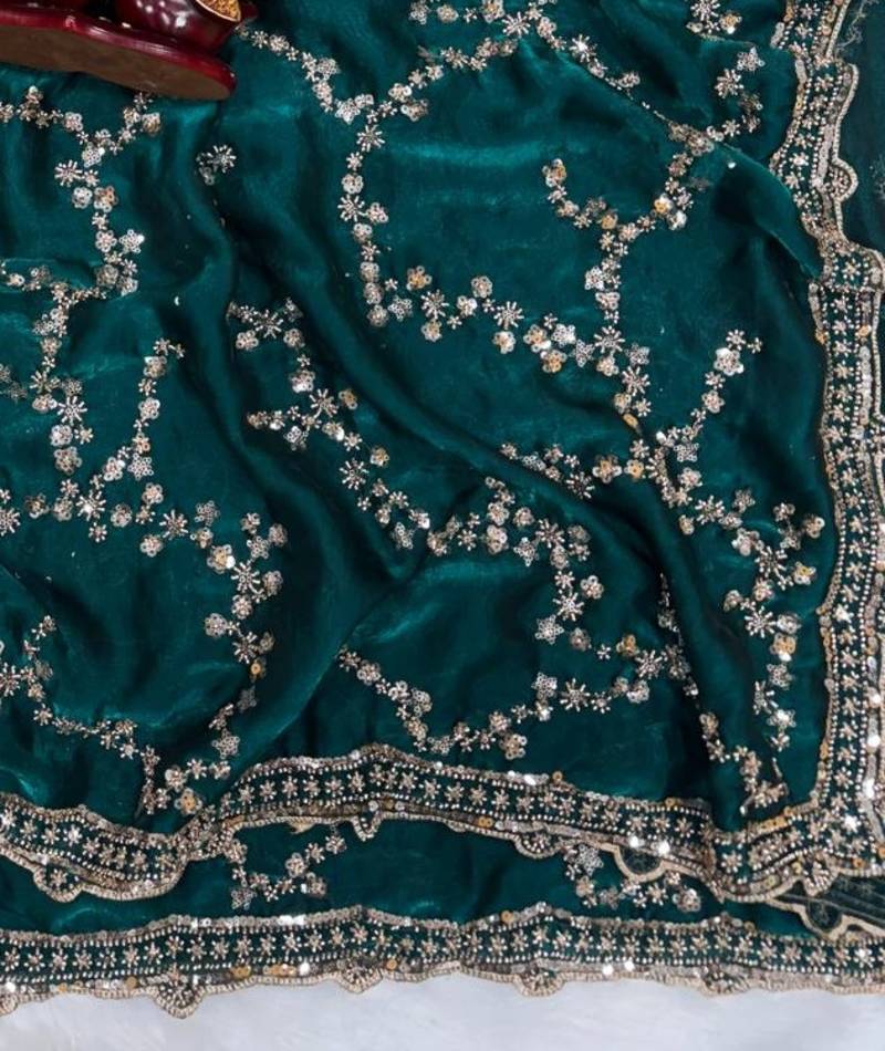 Emerald Color Beads And Sequence Embroidery Work Space Silk Blend Saree