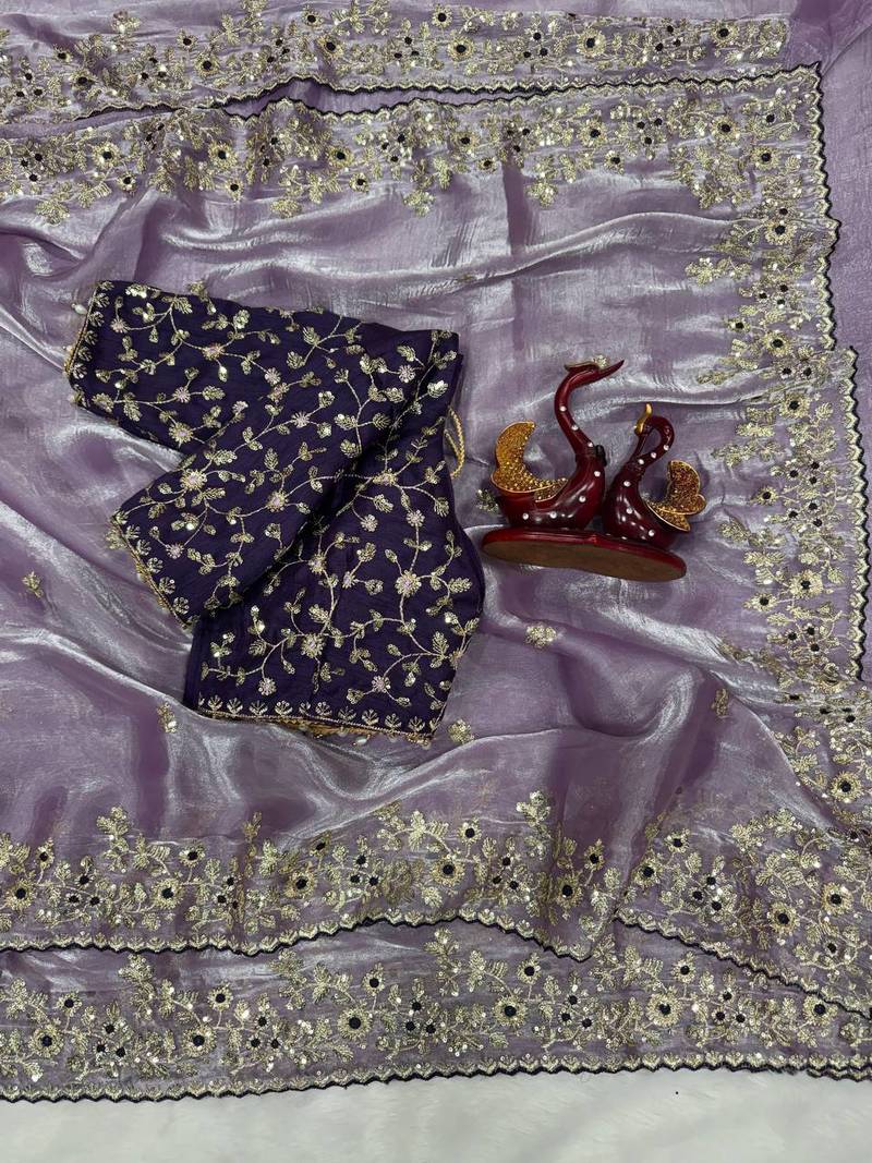 Lavender Color Sequence Embroidery Work Organza Saree