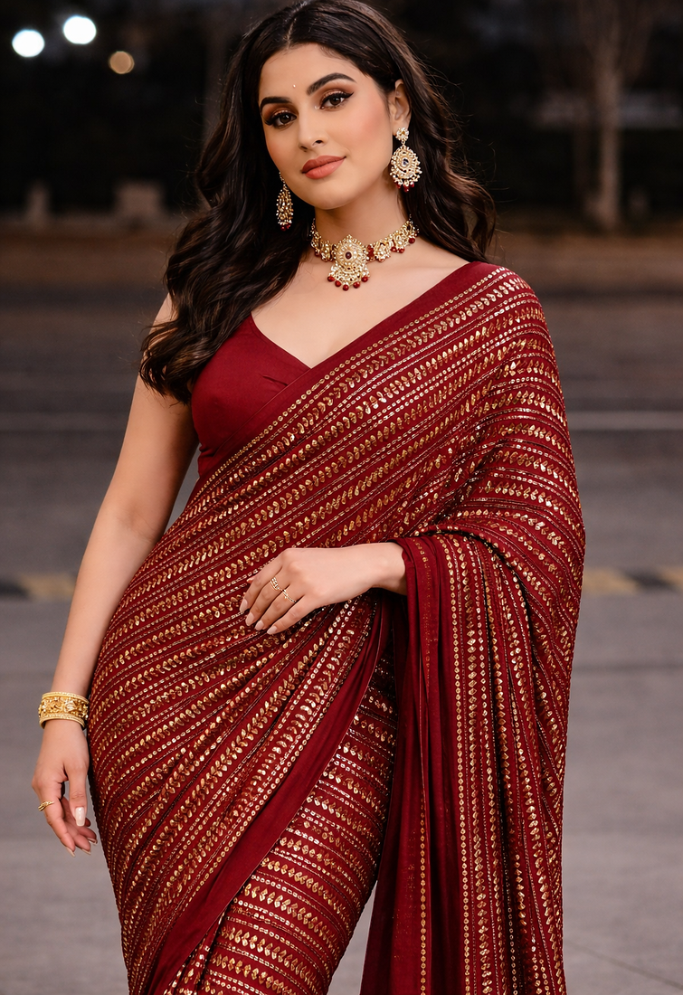 Maroon Color All Over Sequence Work Georgette Saree