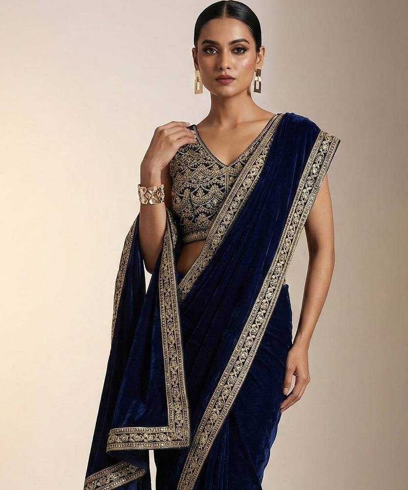 • Saree : Color- Navy Blue / Fabric- Velvet • Blouse : Color- Navy Blue / Fabric- Velvet Saree Details
