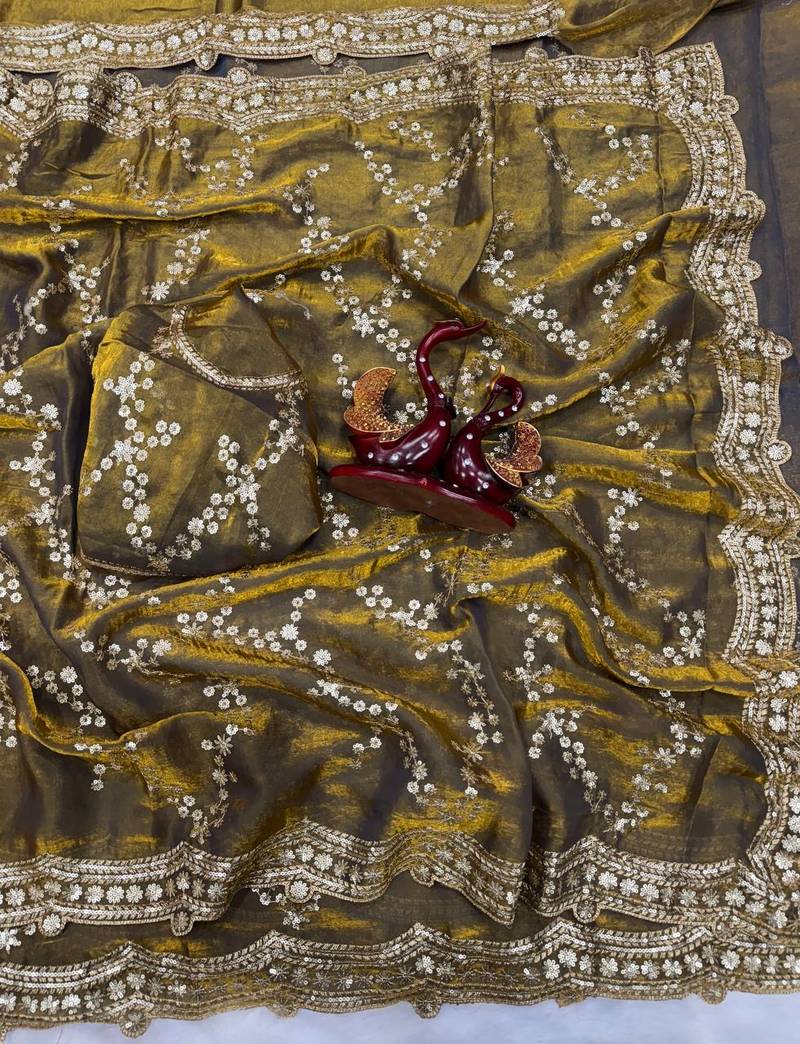 Olive Color Embroidered Space Silk Saree