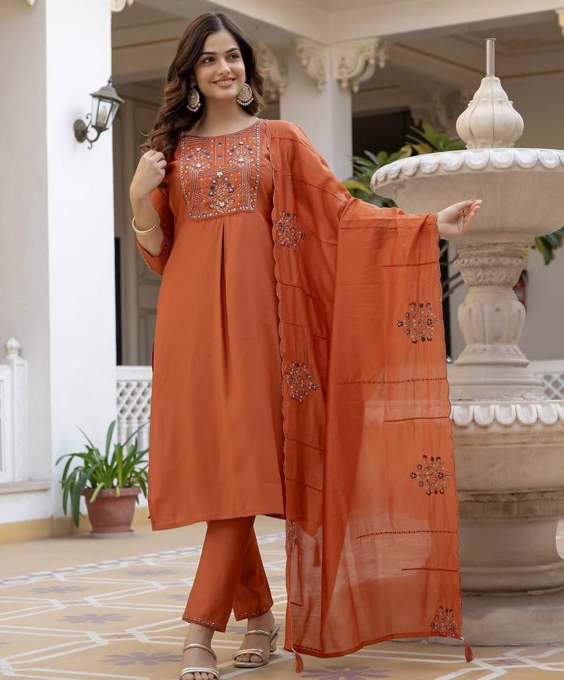Orange Color Embroidery Sequins With Hand Work Viscose Silk Kurta Pant Set Stitched