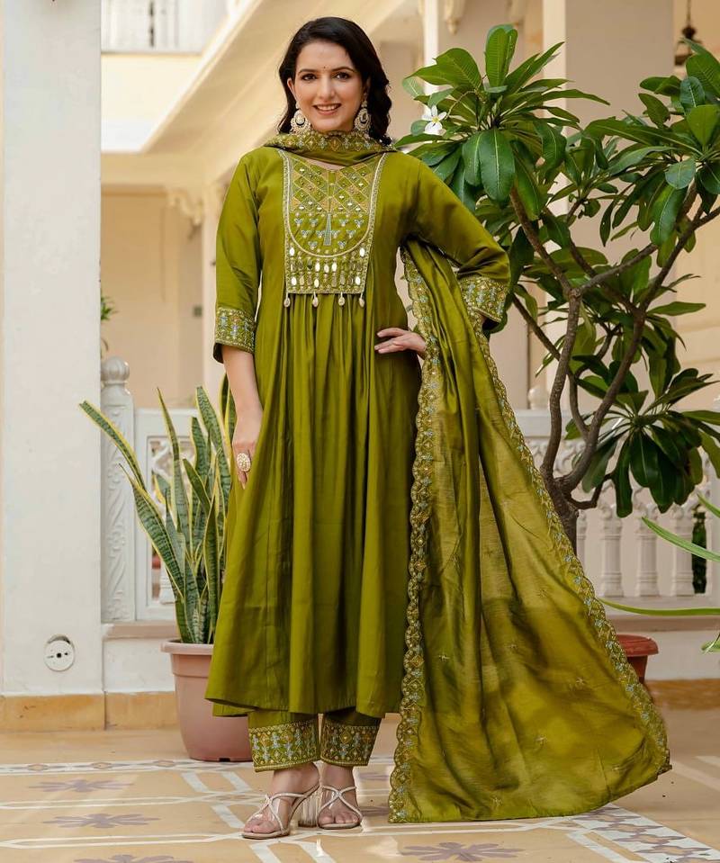 Pear Color Embroidery Thread With Real Mirror Hand Work Viscose Roman Silk Kurta Pant Set.