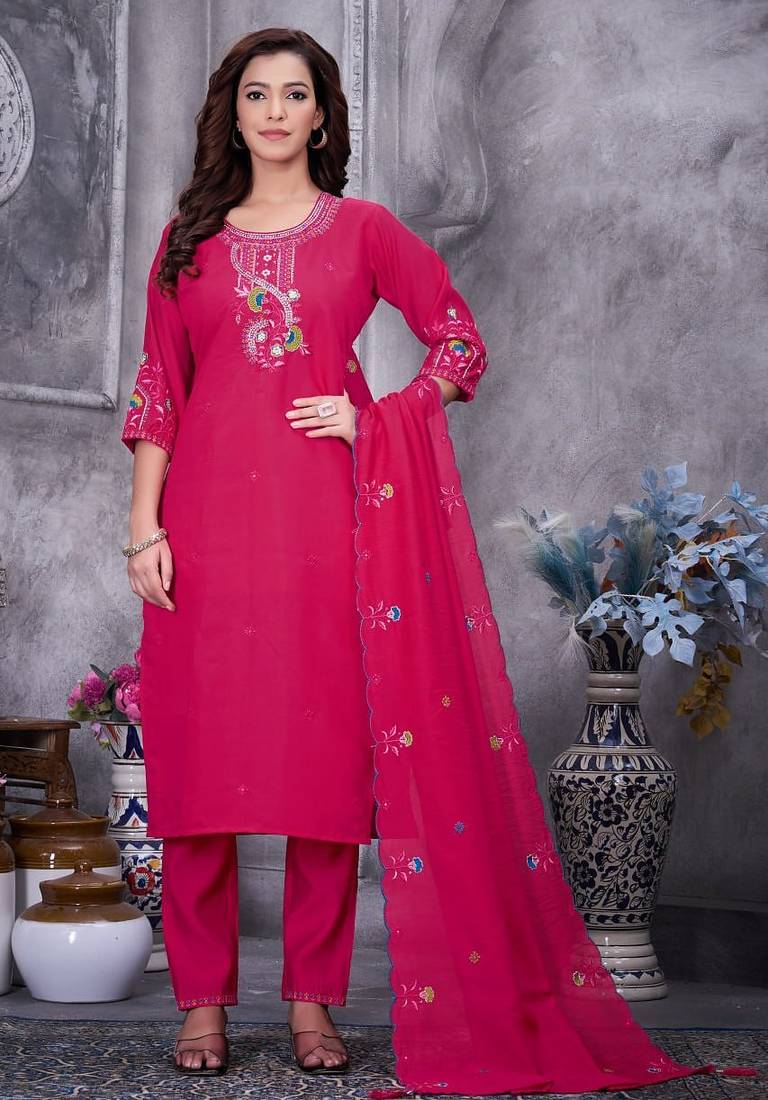• Product Id : 4712046 • Package Details : 1 Kurti/1 Pant/1 Dupatta • Type : Kurta Sets • Occasion : Festive • Type : Hand Embroidery • Look : Traditional • Sleeve : Half Sleeve • Neck Style : U Neck • Color : Rani Pink • Fabric : Silk Blend • Work : Thread Embroidery • Stitching : Stitched Payments [+]