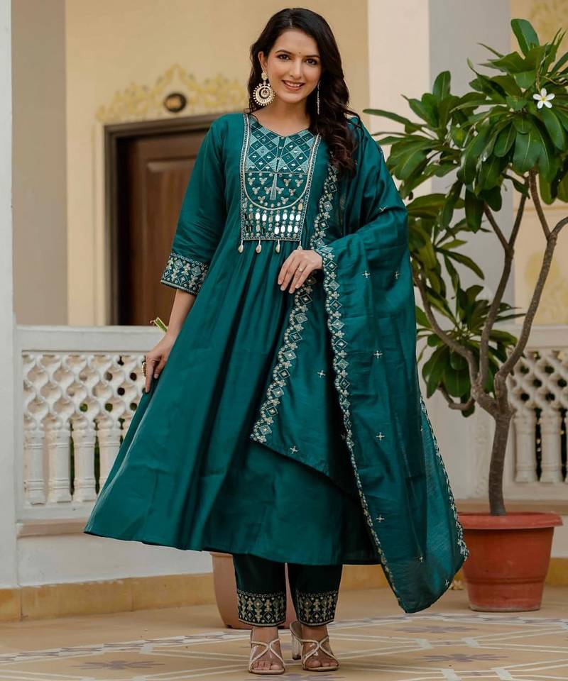 Teal Color Embroidery Thread With Real Mirror Hand Work Viscose Roman Silk Kurta Pant Set.