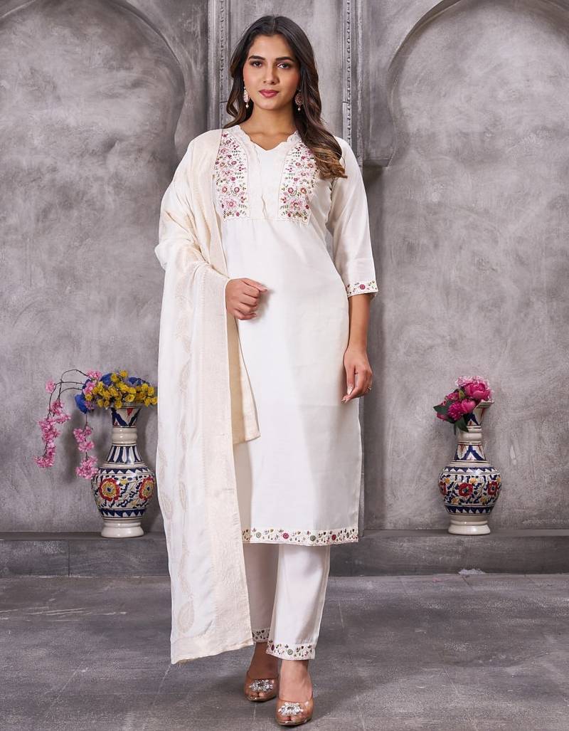 • Product Id : 4713592 • Package Details : 1 Kurti/1 Pant/1 Dupatta • Type : Kurta Sets • Occasion : Wedding • Fabric : Silk • Work : Woven • Type : Hand Embroidery • Look : Designer • Sleeve : Half Sleeve • Neck Style : V Neck • Color : White • Stitching : Stitched • Length : 46 Inch Payments [+]