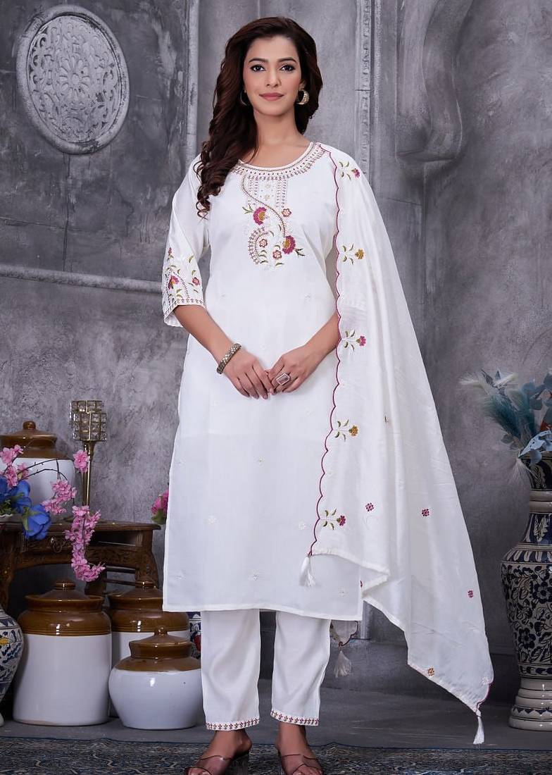 • Product Id : 4712075 • Package Details : 1 Kurti/1 Pant/1 Dupatta • Type : Kurta Sets • Occasion : Festive • Type : Hand Embroidery • Look : Traditional • Sleeve : Half Sleeve • Neck Style : U Neck • Color : White • Fabric : Silk Blend • Work : Thread Embroidery • Stitching : Stitched Payments [+]
