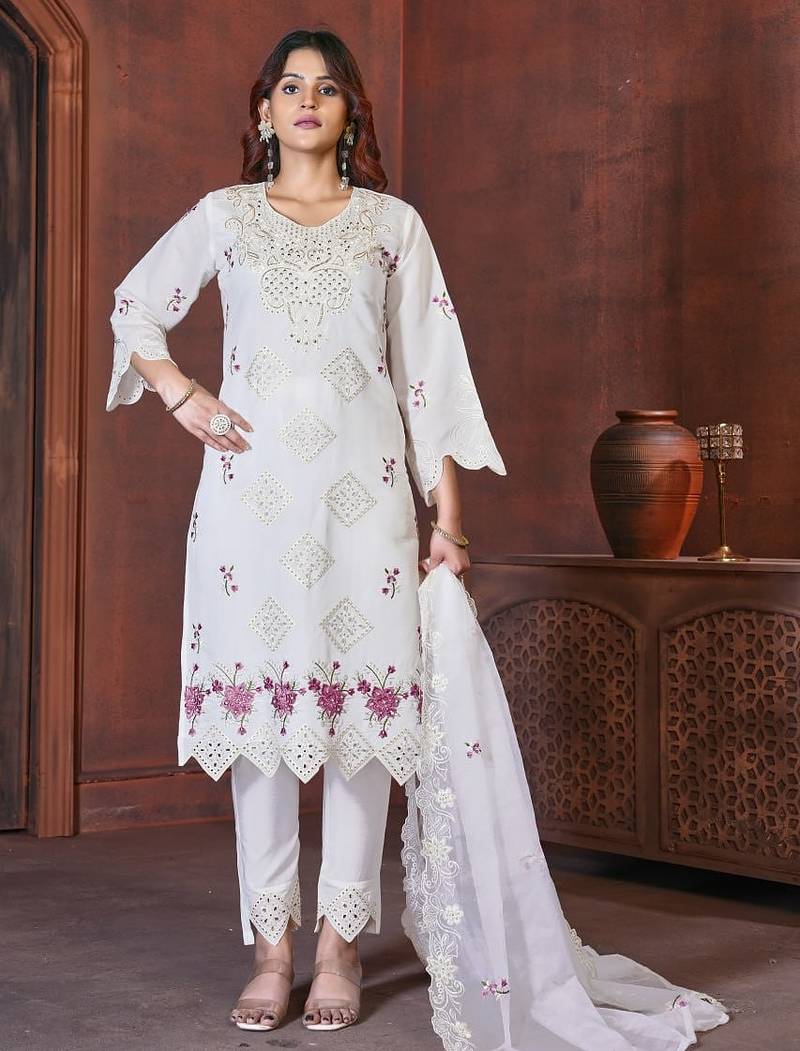 White Color Embroidery With Sequins & Heavy Hand Work Viscose Roman Kurti Pant Set Stitched