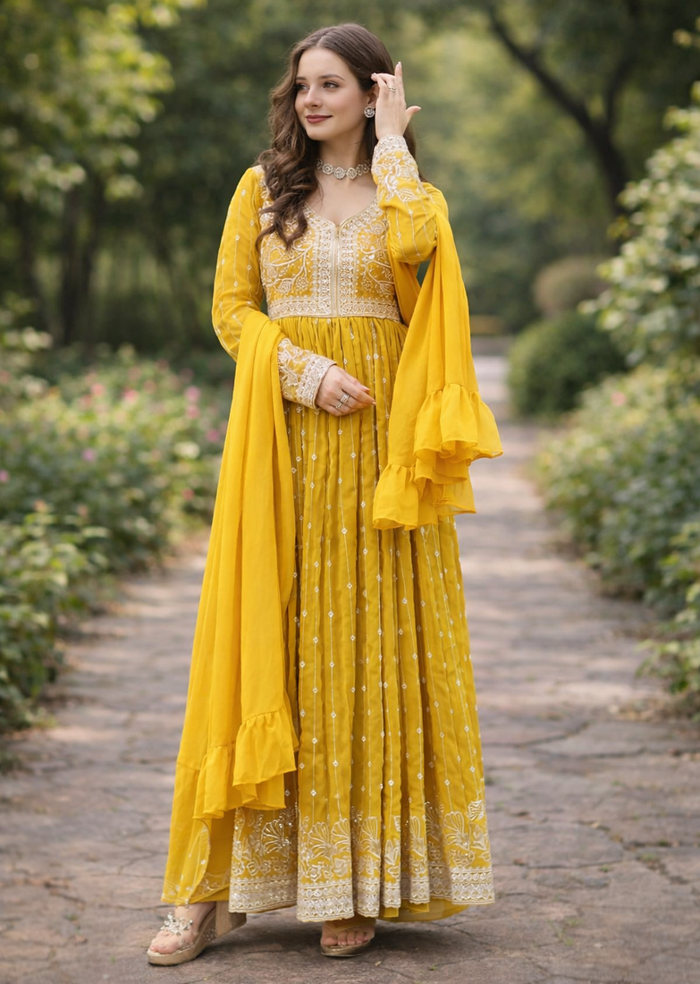 • Product Id : 4707337 • Package Details : 1 Kurti/1 Plazzo/1 Dupatta • Type : Kurta Sets • Occasion : Wedding • Fabric : Georgette • Work : Embroidered • Type : Thread Work • Look : Fashion • Sleeve : Full Sleeve • Neck Style : V Neck • Color : Yellow • Stitching : Stitched • Length : 50 Inch Payments [+]