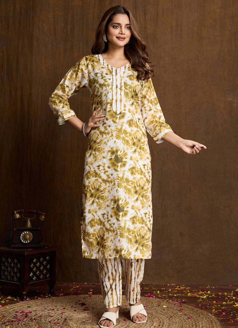 • Product Id : 4706027 • Package Details : 1 Top/ 1 Bottom • Type : Kurta Sets • Work : Printed • Sleeve : Elbow Sleeve • Neck Style : V Neck • Fabric : Cotton • Color : Cream • Stitching : Stitched Payments [+]