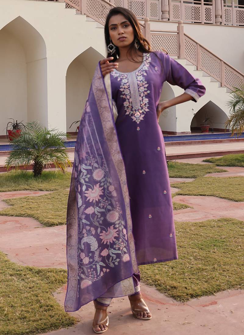 embrace graceful elegance with this stunning lavender simmer silk salwar suit, designed for women who appreciate luxurious fabrics and refined embroidery artistry. this complete three-piece ensemble showcases premium materials, intricate threadwork, and sophisticated detailing for timeless celebratory style.