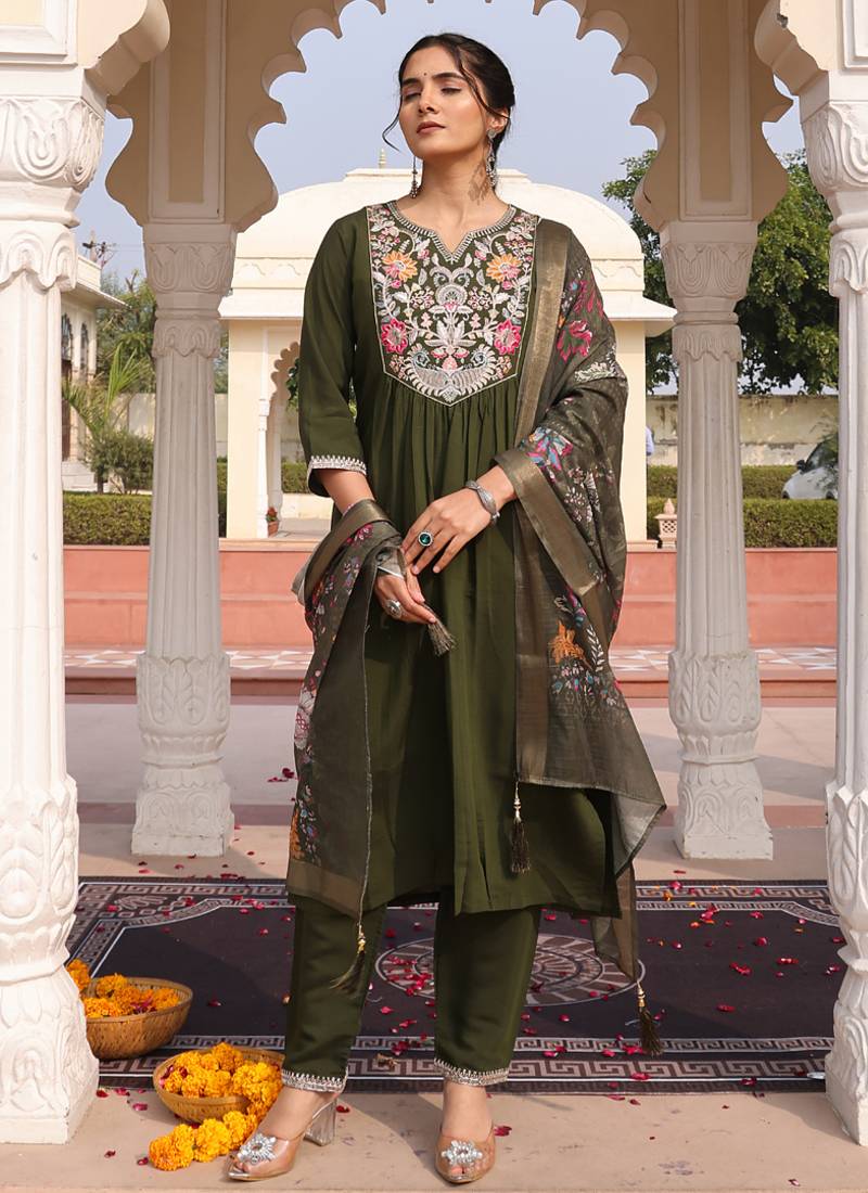 • Product Id : 4692862 • Package Details : 1 Top/1 Bottom/ 1 Dupatta • Type : Kurta Sets • Occasion : Ceremonial • Work : Embroidered • Sleeve : Elbow Sleeve • Neck Style : V Neck • Fabric : Cotton Silk • Color : Mehendi • Stitching : Stitched Payments [+]