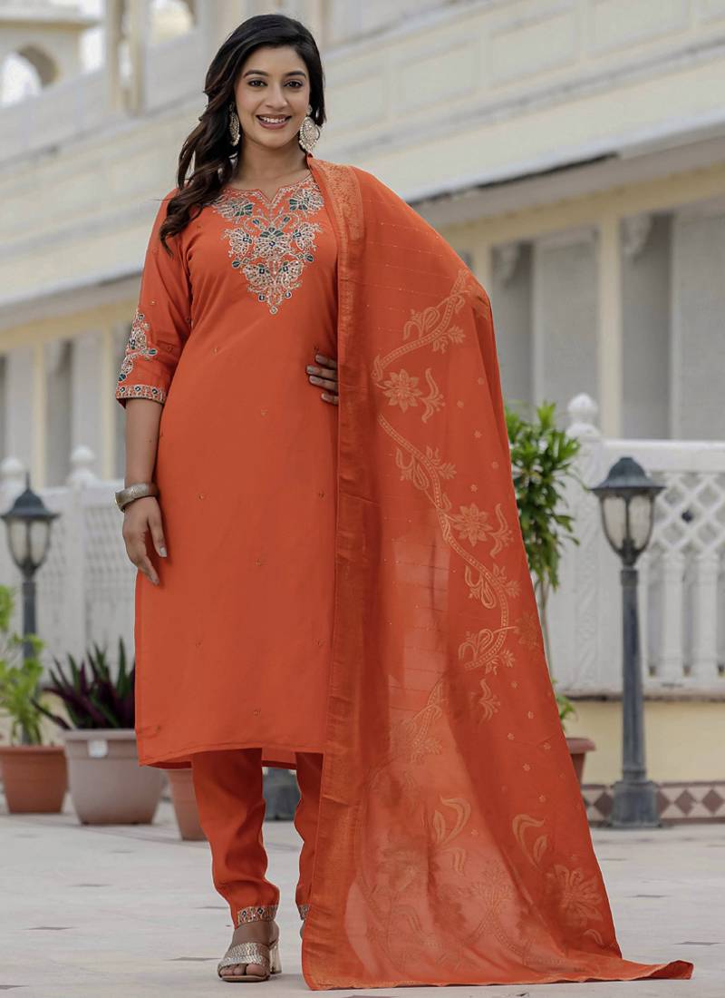 • Product Id : 4671536 • Package Details : 1 Top/1 Bottom/1 Dupatta • Type : Kurta Sets • Occasion : Ceremonial • Work : Embroidered • Type : Sequins Work • Sleeve : Elbow Sleeve • Neck Style : Round Neck • Fabric : Silk • Color : Orange • Stitching : Stitched Payments [+]