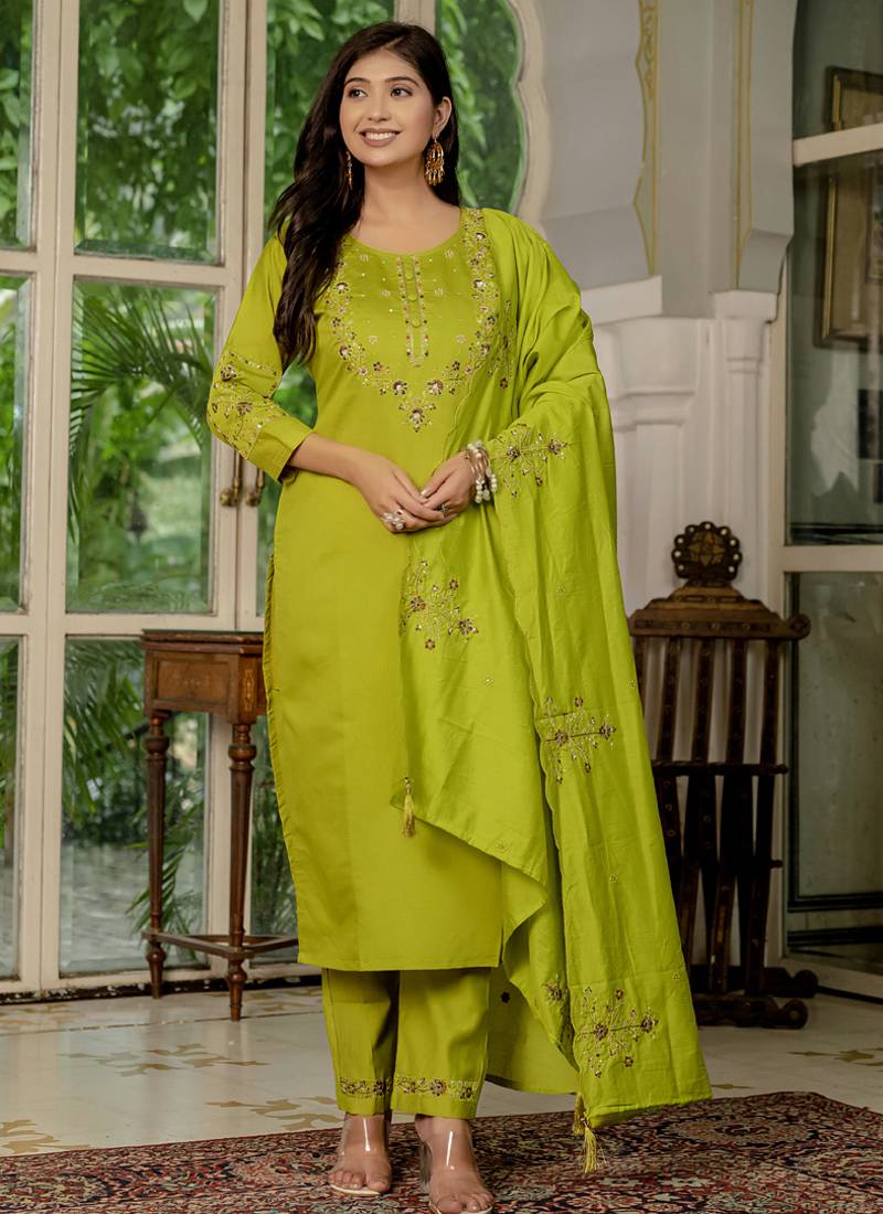 • Product Id : 4671535 • Package Details : 1 Top/1 Bottom/1 Dupatta • Type : Kurta Sets • Occasion : Ceremonial • Type : Hand Embroidery • Sleeve : Elbow Sleeve • Neck Style : Round Neck • Fabric : Silk • Color : Parrot Green • Work : Thread Embroidery • Stitching : Stitched Payments [+]