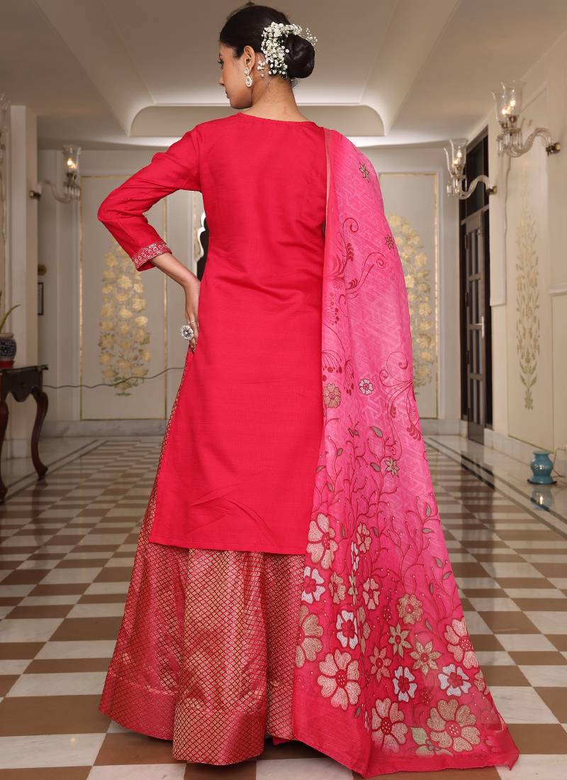 make a striking impression with this gorgeous pink cotton silk salwar suit in lehenga-inspired style, expertly designed for women who love bold, celebratory ethnic fashion. this complete ensemble showcases luxurious fabrics, intricate sequin embroidery, and contemporary styling for a showstopping look.