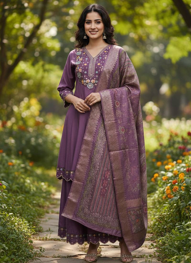 Purple Cotton Silk Thread And Sequin Embroidered Palazzo Suit Stitched