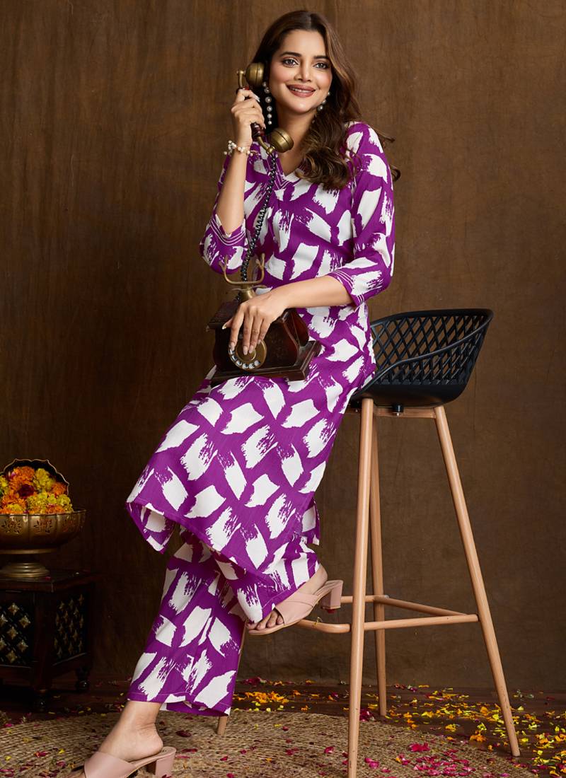 • Product Id : 4706017 • Package Details : 1 Top/ 1 Bottom • Type : Co Ord Sets • Work : Printed • Sleeve : Elbow Sleeve • Neck Style : V Neck • Fabric : Cotton • Color : Purple • Stitching : Stitched Payments [+]