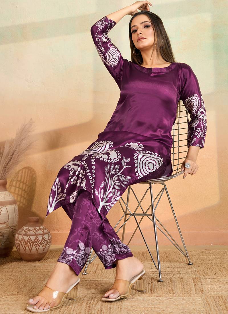 Purple Printed Cotton Reyon Kurta Pant Set Stitched