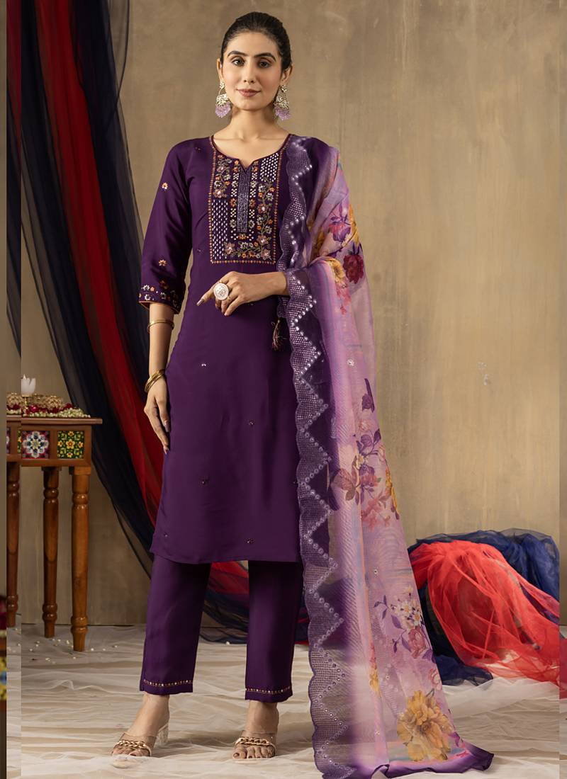 • Product Id : 4671276 • Package Details : 1 Top/1 Bottom/1 Dupatta • Type : Kurta Sets • Occasion : Ceremonial • Work : Embroidered • Type : Hand Embroidery • Sleeve : Elbow Sleeve • Neck Style : Round Neck • Fabric : Art Silk • Color : Purple • Stitching : Stitched Payments [+]