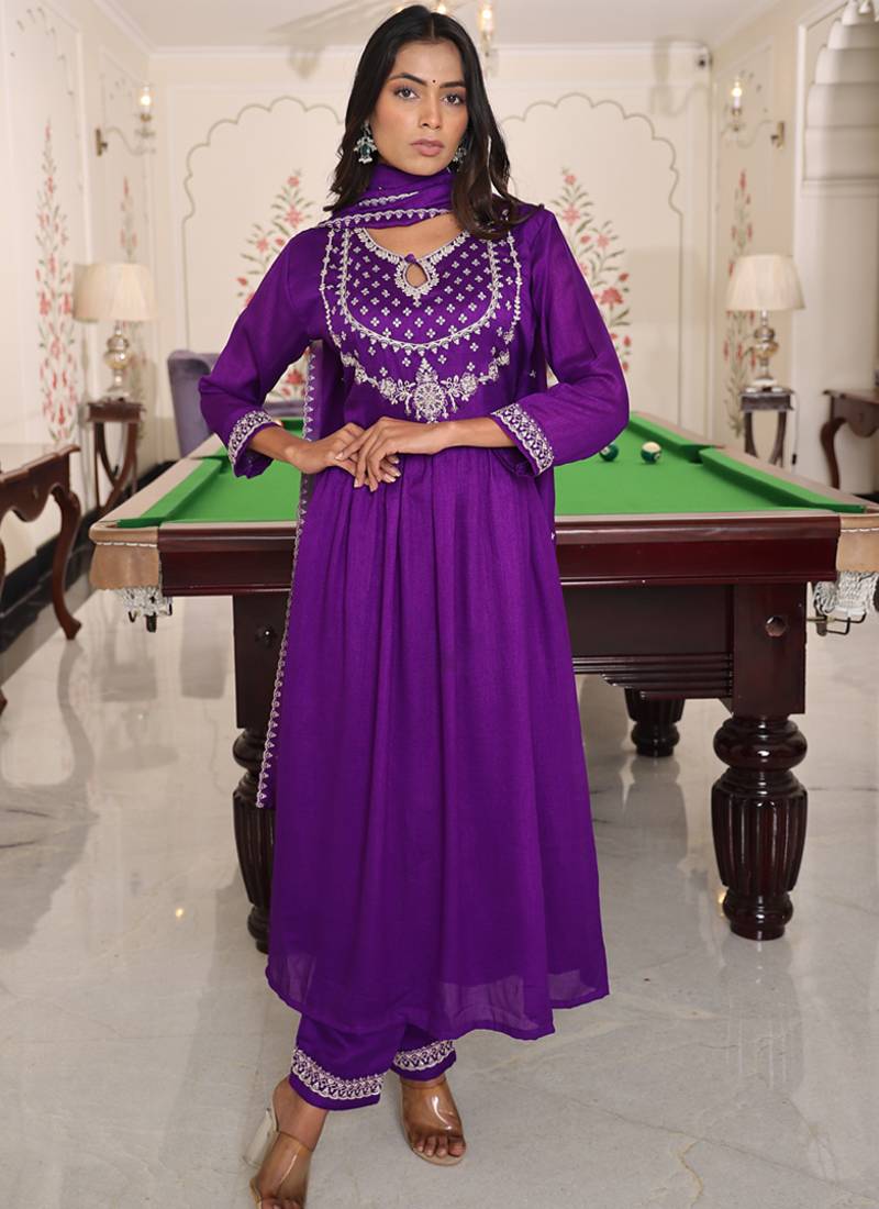 captivate with grace and elegance in this luxurious purple soft silk salwar suit, designed for women who appreciate premium fabrics and refined embroidery artistry. this exquisite three-piece ensemble combines sumptuous textures, intricate embroidery, and sophisticated detailing for timeless festive style.