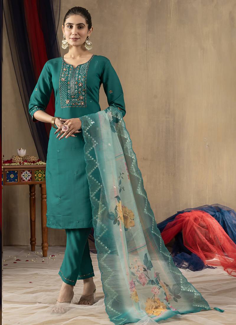 • Product Id : 4671277 • Package Details : 1 Top/1 Bottom/1 Dupatta • Type : Kurta Sets • Occasion : Ceremonial • Work : Embroidered • Type : Hand Embroidery • Sleeve : Elbow Sleeve • Neck Style : Round Neck • Fabric : Art Silk • Color : Turquoise • Stitching : Stitched Payments [+]