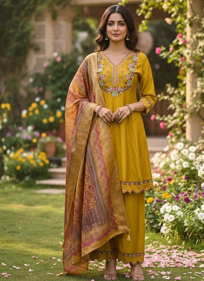 • Product Id : 4692849 • Package Details : 1 Top/1 Bottom/ 1 Dupatta • Type : Kurta Sets • Occasion : Ceremonial • Work : Embroidered • Sleeve : Elbow Sleeve • Neck Style : V Neck • Fabric : Cotton Silk • Color : Yellow • Stitching : Stitched Payments [+]