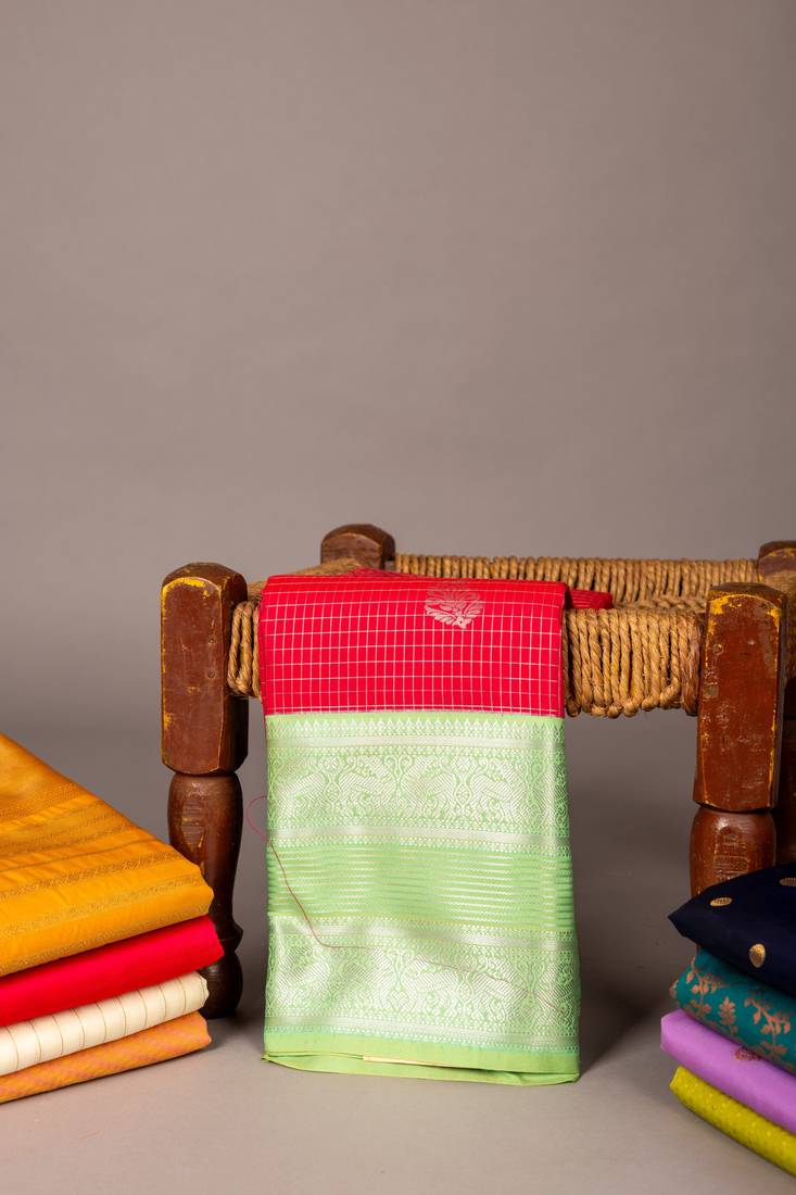 • Saree : Color- Red / Fabric- Silk • Blouse : Color- Green / Fabric- Silk Saree Details