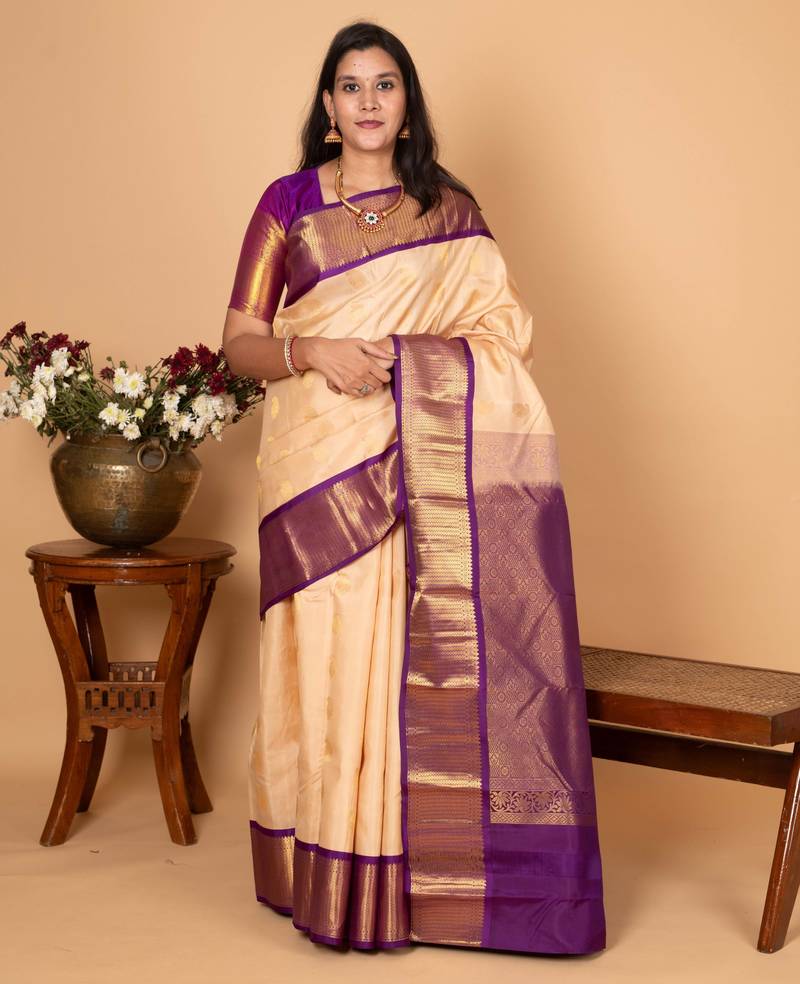 Bone White And Blue Violet Pure Kanchi Silk Saree
