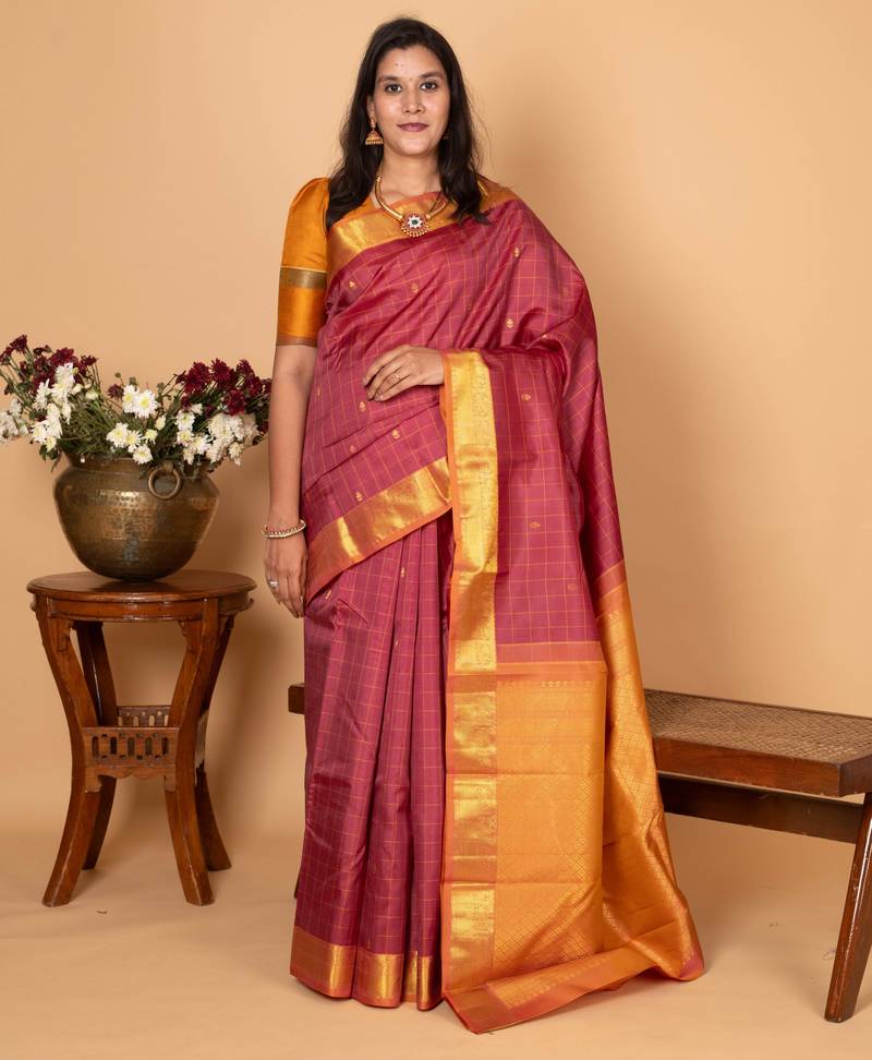 Garnet Red Checked Pure Kanjivaram Silk Saree
