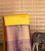 Celebrate tradition with this majestic Kanjivaram silk saree, where a luminous yellow body meets a regal blue border in a harmonious blend of vibrance and grace. The saree’s body is accentuated with subtle golden threadwork and delicate checks, while the border and pallu are resplendent with intricate floral zari weaving in gold — a nod to classic South Indian artistry.