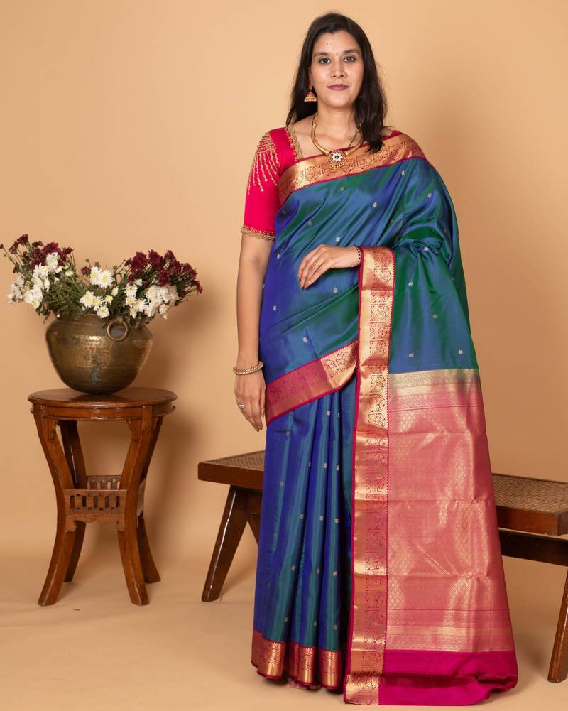 Peacock Blue And Magenta Pure Kanjivaram Silk Saree