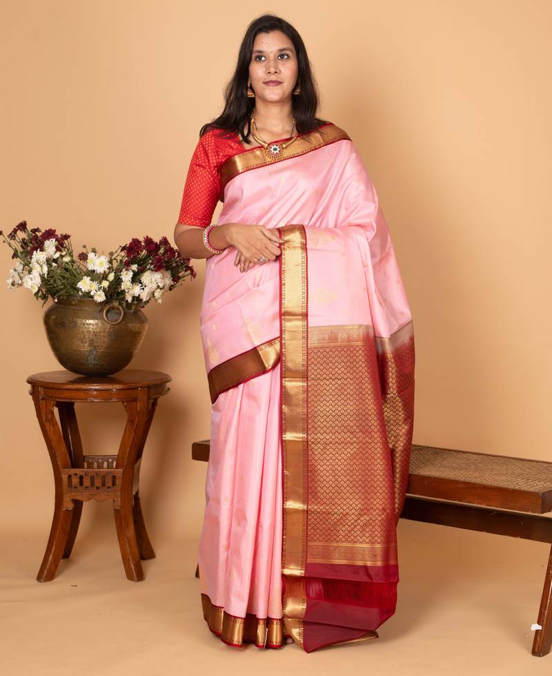 • Saree : Color- Pink / Fabric- Silk • Blouse : Color- Apple Red / Fabric- Silk Saree Details