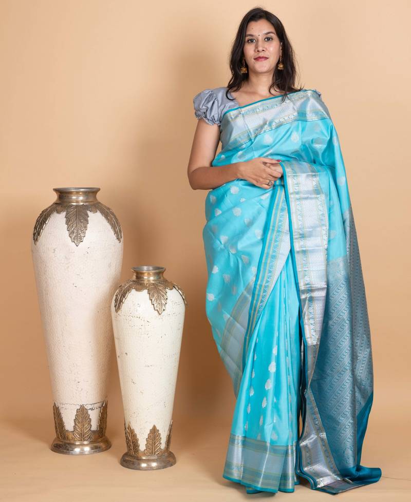 • Saree : Color- Blue / Fabric- Silk • Blouse : Color- Deep Sky Blue / Fabric- Silk Saree Details