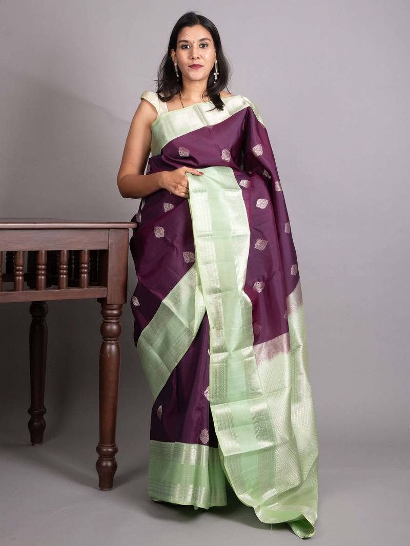 • Saree : Color- Violet / Fabric- Silk • Blouse : Color- Green / Fabric- Silk Saree Details