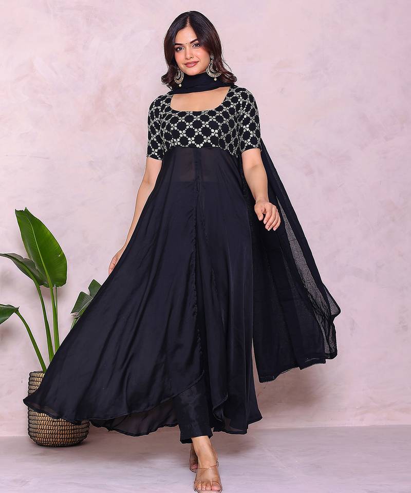 • Product Id : 4695615 • Package Details : 1 Kurta,1bottom,1dupatta • Type : Kurta Sets • Look : Designer • Sleeve : Elbow Sleeve • Neck Style : Round Neck • Work : Zari • Fabric : Silk • Color : Black • Stitching : Stitched Payments [+]