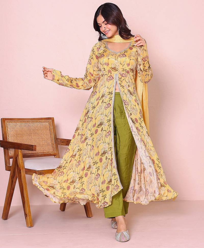 Floral Printed V Neck Kurta With Trousers & Dupatta Stitched