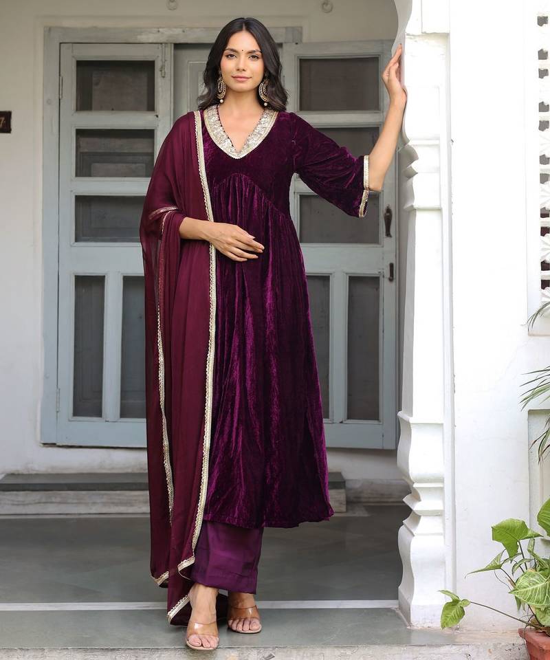 • Product Id : 4695626 • Package Details : 1 Kurta,1bottom,1dupatta • Type : Kurta Sets • Look : Designer • Sleeve : Quarter Sleeve • Neck Style : V Neck • Fabric : Velvet • Color : Wine • Work : Zardosi • Stitching : Stitched Payments [+]