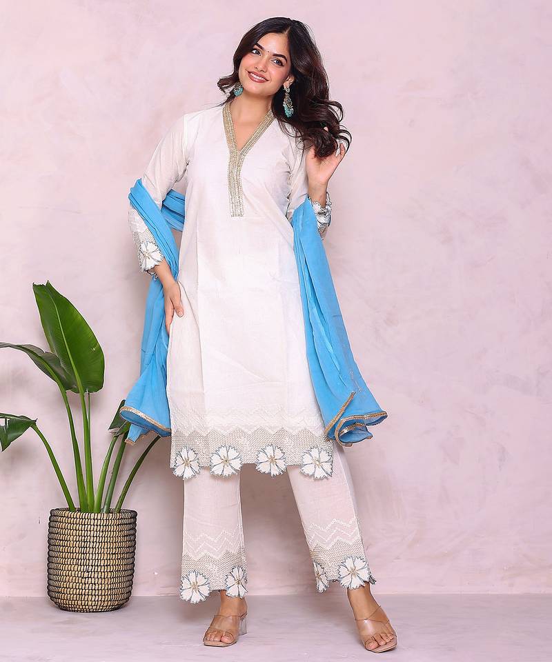 • Product Id : 4695623 • Package Details : 1 Kurta,1bottom,1dupatta • Type : Kurta Sets • Look : Designer • Sleeve : Full Sleeve • Neck Style : V Neck • Fabric : Cotton • Color : Off White • Work : Thread Embroidery • Stitching : Stitched Payments [+]