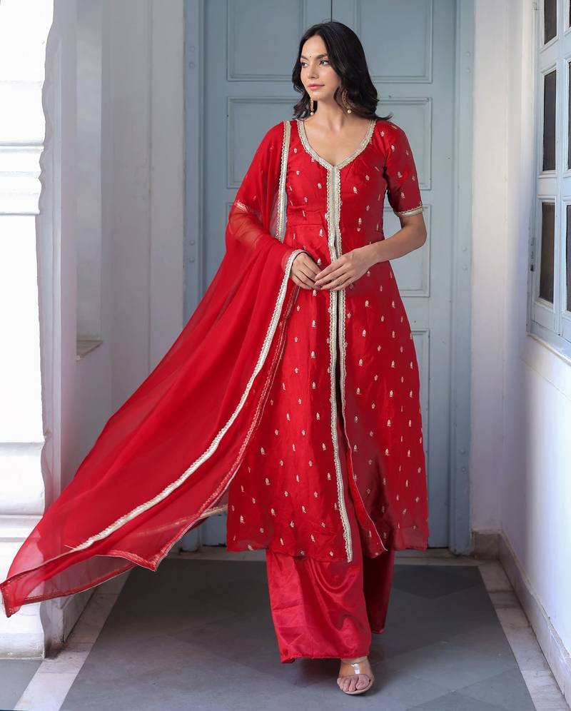 • Product Id : 4695629 • Package Details : 1 Kurta,1bottom,1dupatta • Type : Kurta Sets • Look : Designer • Sleeve : Elbow Sleeve • Neck Style : V Neck • Work : Zari • Fabric : Silk • Color : Red • Stitching : Stitched Payments [+]