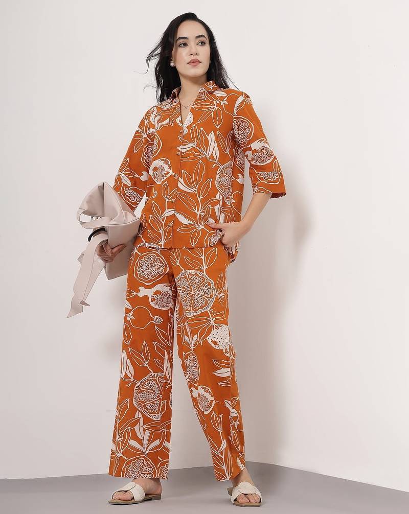 If you find the product for less we'll match it! Know MoreCoordinated shirt and pants set in breathable cotton with classic collar, quarter sleeves, button-down front, bold orange floral print; fully lined