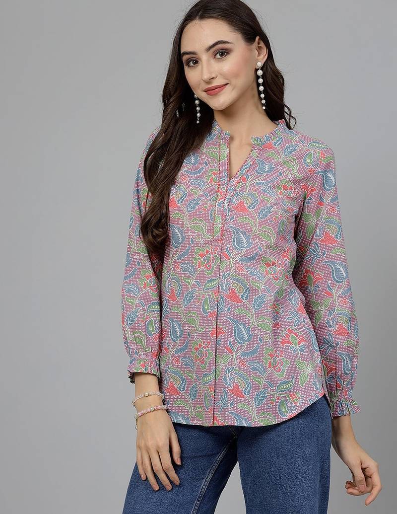 Mauve Floral Printed Shirt Style Top With Ruffles & Katha