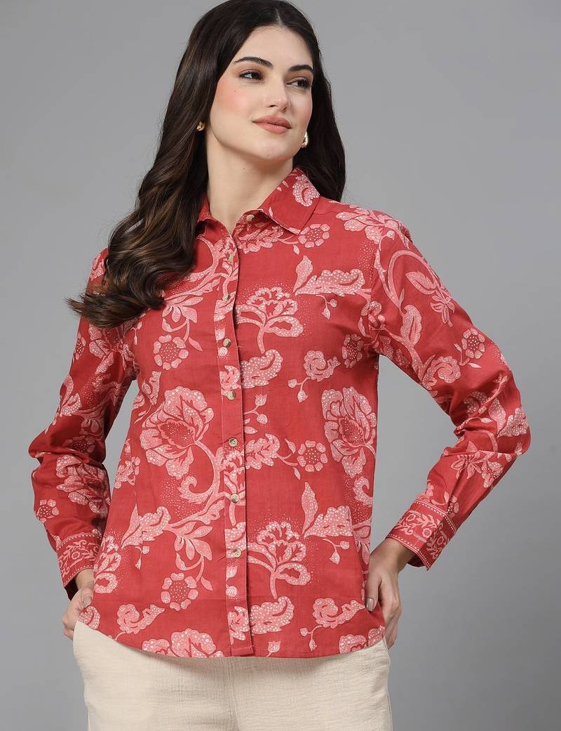 Red Floral Printed Shirt With Spread Collar & Button Placket