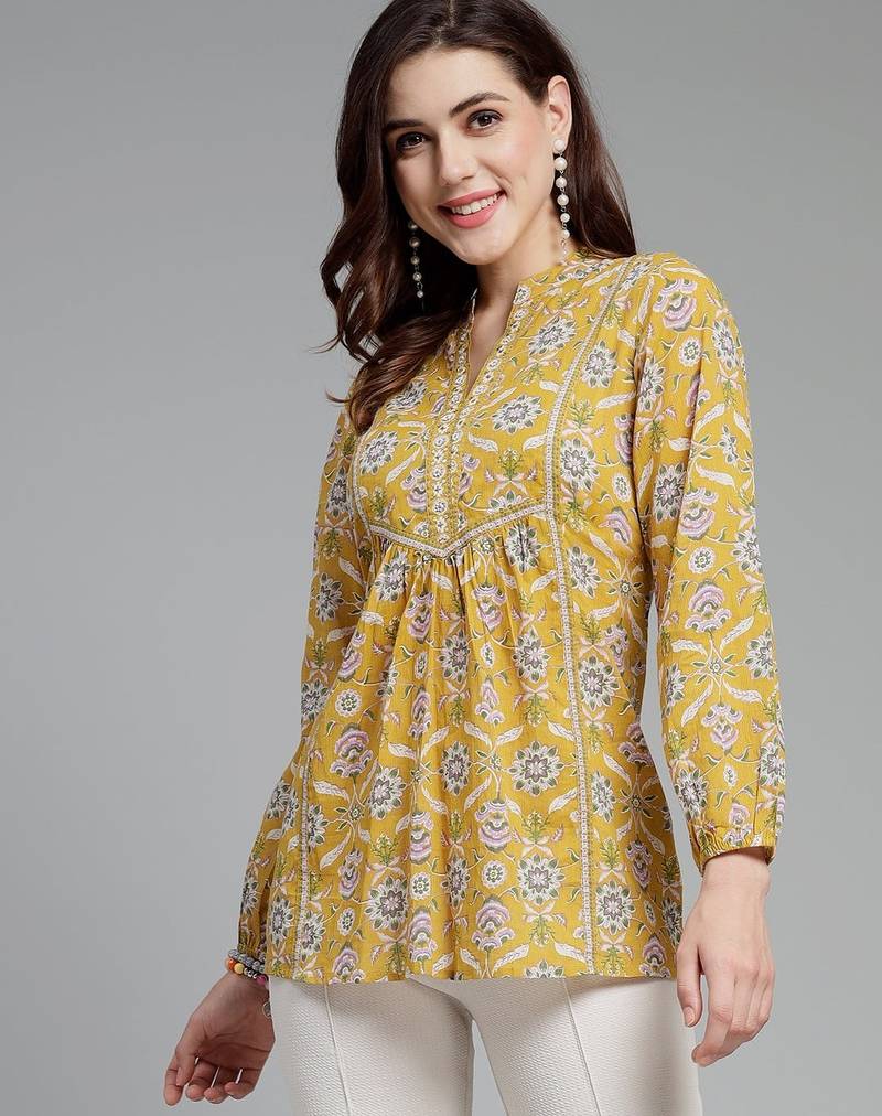 • Product Id : 4672953 • Package Details : 1 Top • Type : Short Kurtis • Occasion : Casual • Fabric : Cotton • Work : Embroidered • Look : Fashion • Sleeve : Full Sleeve • Neck Style : V Neck • Color : Yellow • Stitching : Stitched General - Color and Texture may have slight variation. This happens because of photography.