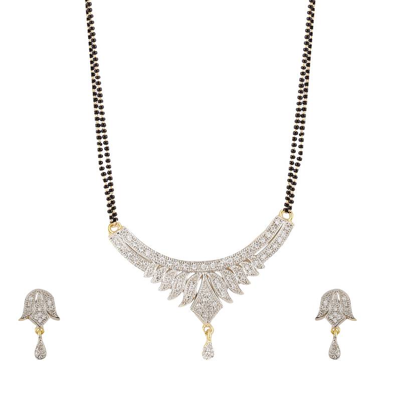 • Product Id : 666383 • Package Details : 1 Mangalsutra / 1 Pair Of Earrings • Type : Mangalsutra • Occasion : Party Wear • Look : Traditional • Jewellery Work : American Diamonds • Color : Black • Base Material : Copper • Care : Keep Away From Perfume, Deodorant And Water Payments [+]